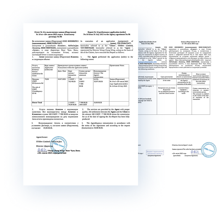 Мы указываем USDT / BTC в наших закрывающих бухгалтерских документах, которые мы предоставляем нашим клиентам по каждой совершенной операции.
